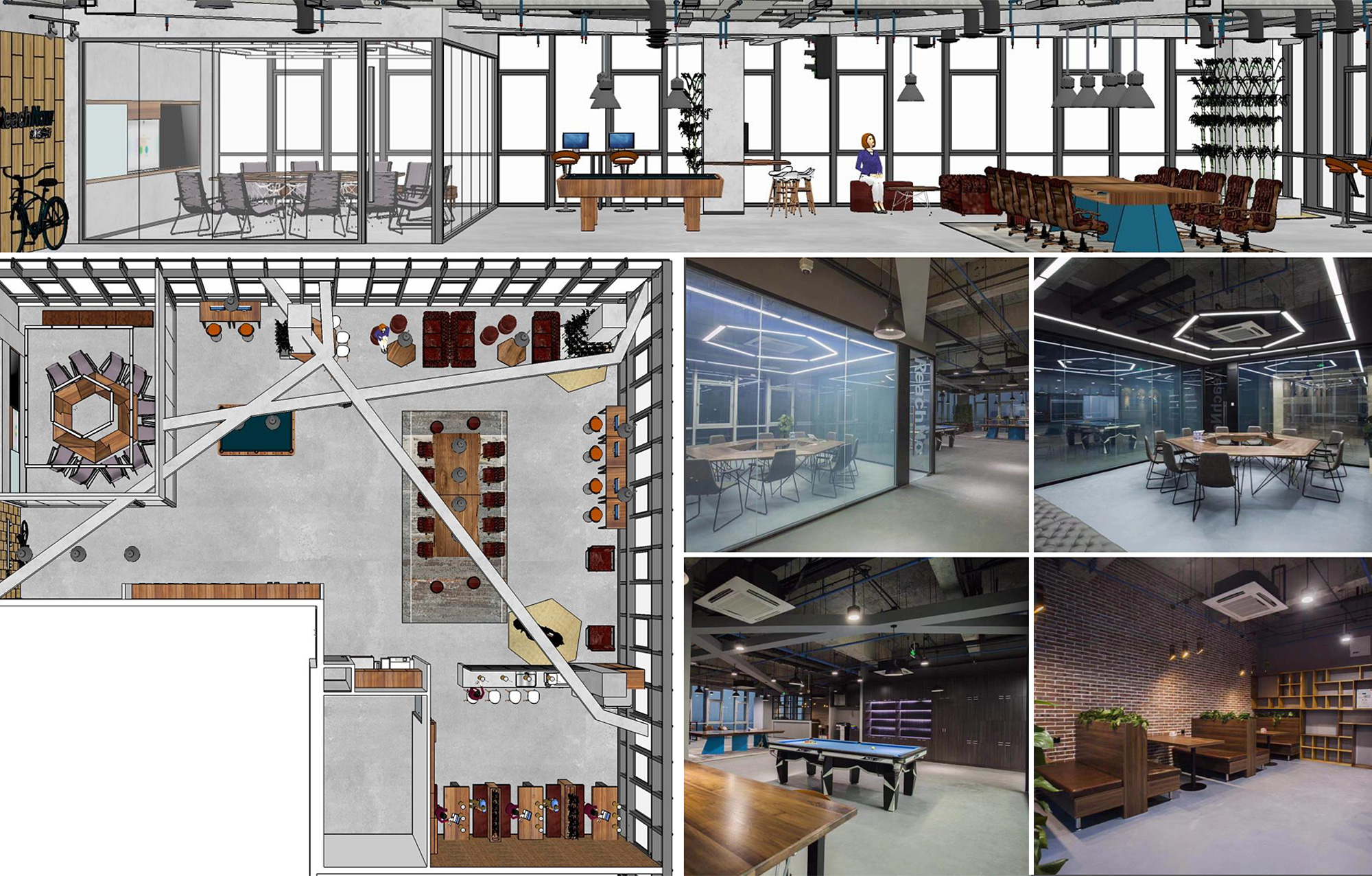 项目描述: 我们的设计意在打造一种现代而又具有工业感的视觉和调性,其灵感来源于客户的业务领域——工程业务。为了重建工业风的空间环境,我们大量应用了具有原生感的材质,如原木、混凝土等,将空间区分为两个不同的区域——面客区和常规工作区。